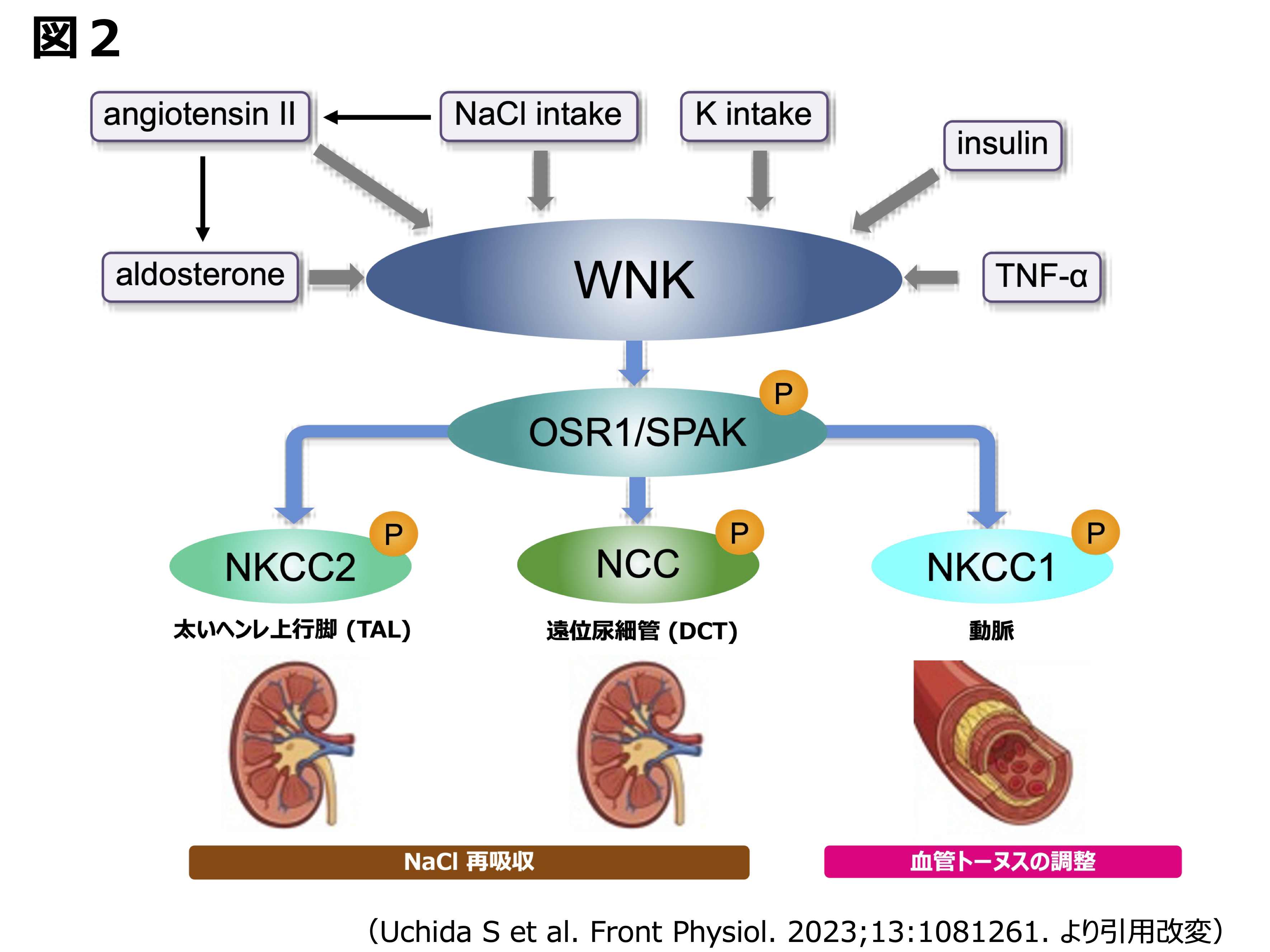 このシグナルは食事中の塩分量によって制御される(高塩では抑制・低塩では活性化)ことに加え、PHAII病態モデルノックインマウス(WNK4D561A/+)では高塩にしても抑制がかからず恒常的に活性化していることが判明し、このことがPHAⅡで持続的にNa再吸収が増加し、高血圧をきたす原因になっていると考えられました9)。