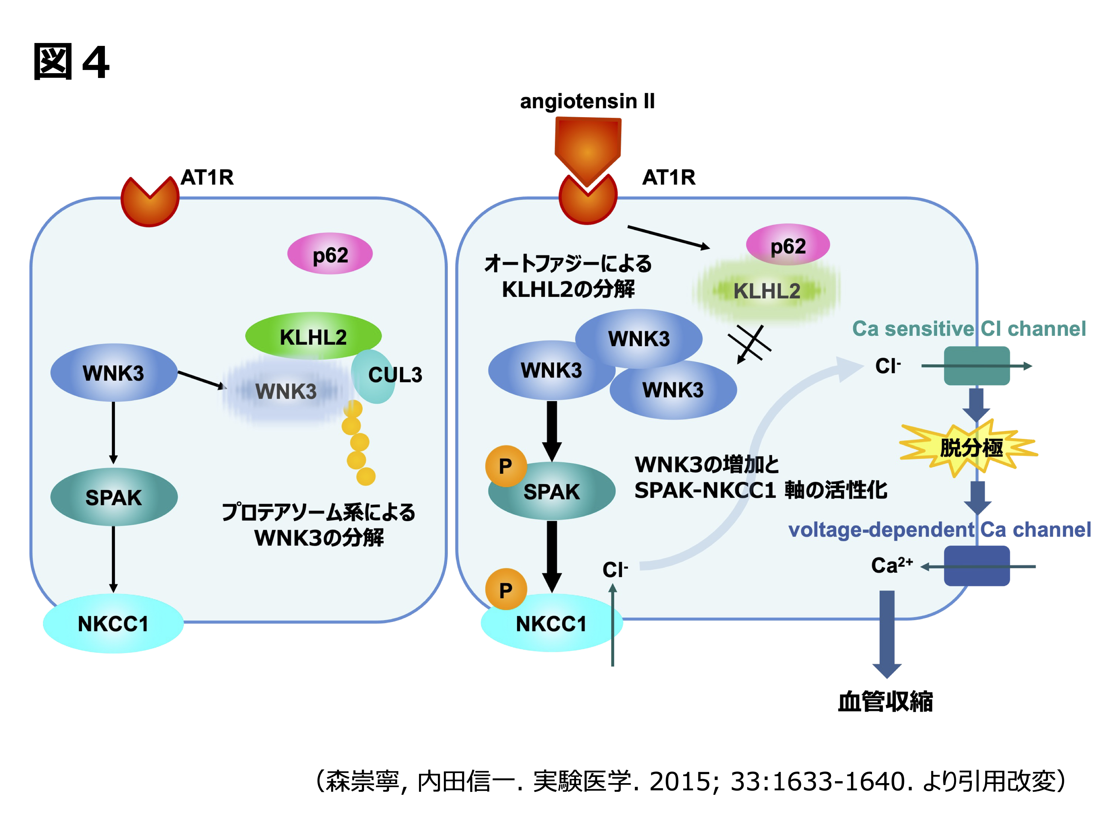 血圧・腎疾患の報告はありませんでしたが同じWNKファミリーに属するWNK3の生理機能を解明すべく、当研究室ではWNK3ノックアウト(KO)マウスを作成し解析を行いました。腎臓での表現系は確認されませんでしたが17)、このマウスに低塩食を与えた際に血圧が低下するという現象が観察されました。このことから腎臓以外、おそらく血管トーヌスにWNKシグナル(WNK3)が関与している可能性が想起されました。WNK3-KOマウスを解析することで、塩分摂取およびアンギオテンシンIIがWNK3-SPAK-NKCC1 リン酸化シグナルを制御し、血管緊張度(トーヌス)調節に関与していることを明らかにしました18)。さらに、KLHL3と極めて相同性の高い同じKLHLファミリーに属するKLHL2に着目し、KLHL3と同様WNKキナーゼの制御に関わる事を確認していたことから19)、血管におけるアンギオテンシンIIによるWNKシグナル活性化にKLHLが関与しているかどうかを検討しました。マウス大動脈と血管平滑筋細胞にはKLHL3ではなくKLHL2のみが発現しており、塩分制限およびアンギオテンシンII負荷によりKLHL2の減少、WNK3の増加が確認されました。ノックダウン実験によりこのシグナルはKLHL2及びWNK3に依存していることを確認し、またKLHL2の減少にはp62 (SQSTM1)を介したオートファジーが関与していることを報告しました18)(図4)。アンギオテンシンIIによる血管トーヌス制御メカニズムにKLHL2-WNK3-SPAK-NKCC1シグナルカスケードが関与することを示し、生理学的にも意義のある知見となりました。