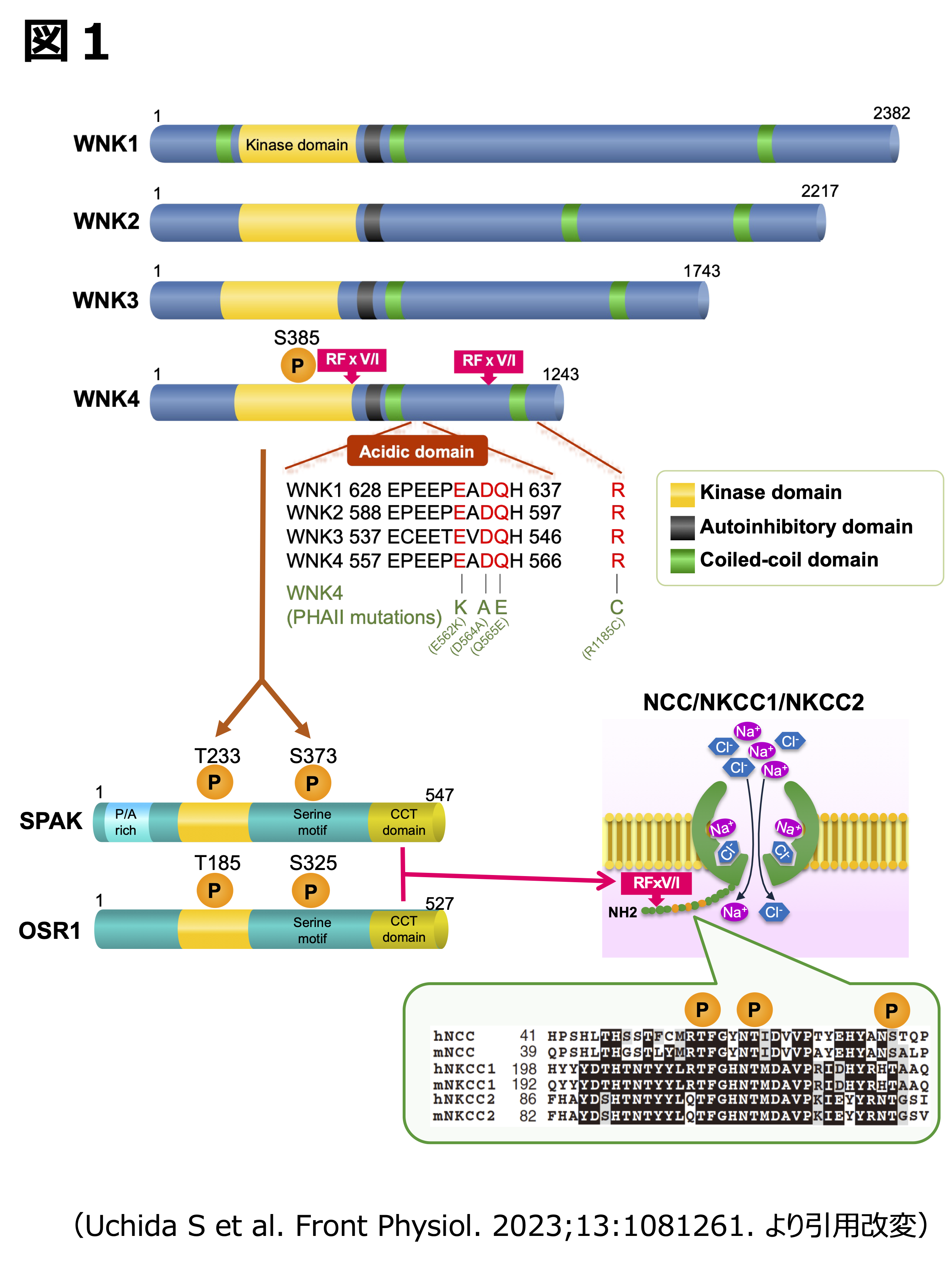 2005年にWNK1とWNK4の基質としてoxidative stress-responsive gene 1 (OSR1)とSte20-related proline-alanine-rich kinase(SPAK)が同定されました(図1)2), 3)。OSR1とSPAKのCCTドメインは、WNKキナーゼ内、及びNCCなどのSLC12A輸送体内のいずれにも存在する特定のアミノ酸配列(RFxV/I モチーフ)と親和性が高いことが報告され、すなわちNCCがOSR1とSPAKの基質であると推察されました。