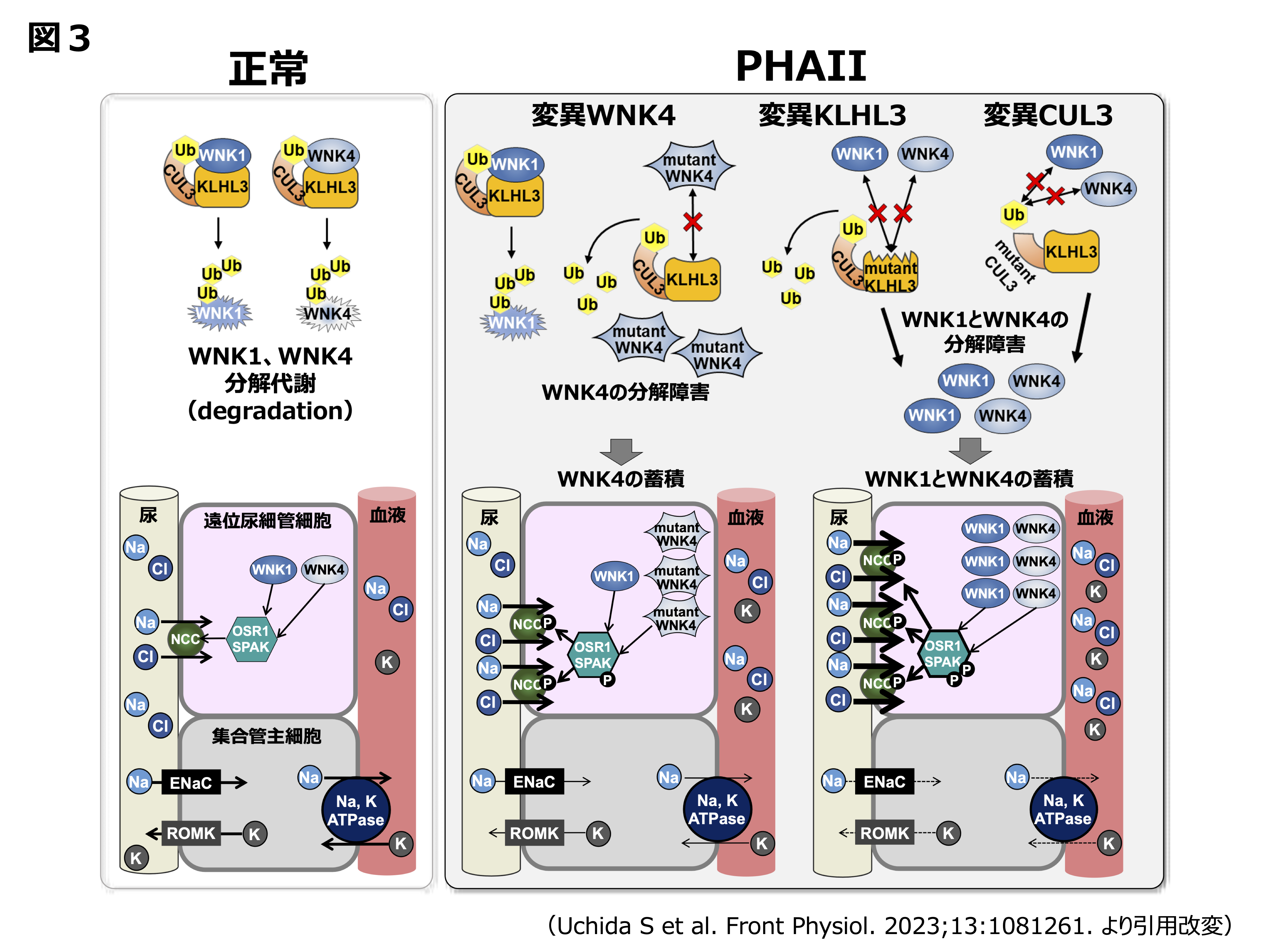 次世代シークエンサー(NGS)を用いた未解決のPHAII家系解析によって、新たにKLHL3とCullin3 の変異が原因として発見されました14), 15)。これまでKLHL蛋白の一部はユビキチンE3リガーゼであるCullin3と結合し、ユビキチン化に関与することが知られていましたが、これら二つの遺伝子変異がWNKシグナルにどのような影響を与え、PHAIIの表現系を呈すのか、そのメカニズムは不明でした。