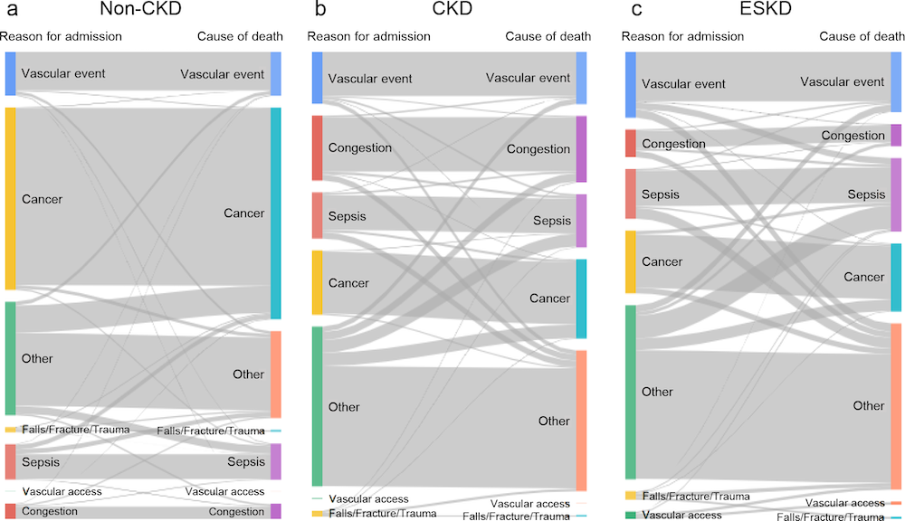 Healthcare Cost and Utilization Projectの7つの臨床疾患分類カテゴリーを、日本人成人の(a) 非CKD、(b) CKD、(c) ESKD(end-stage kidney disease)の各群に適用し、入院時から院内死亡までの疾患分類の変化を可視化した。